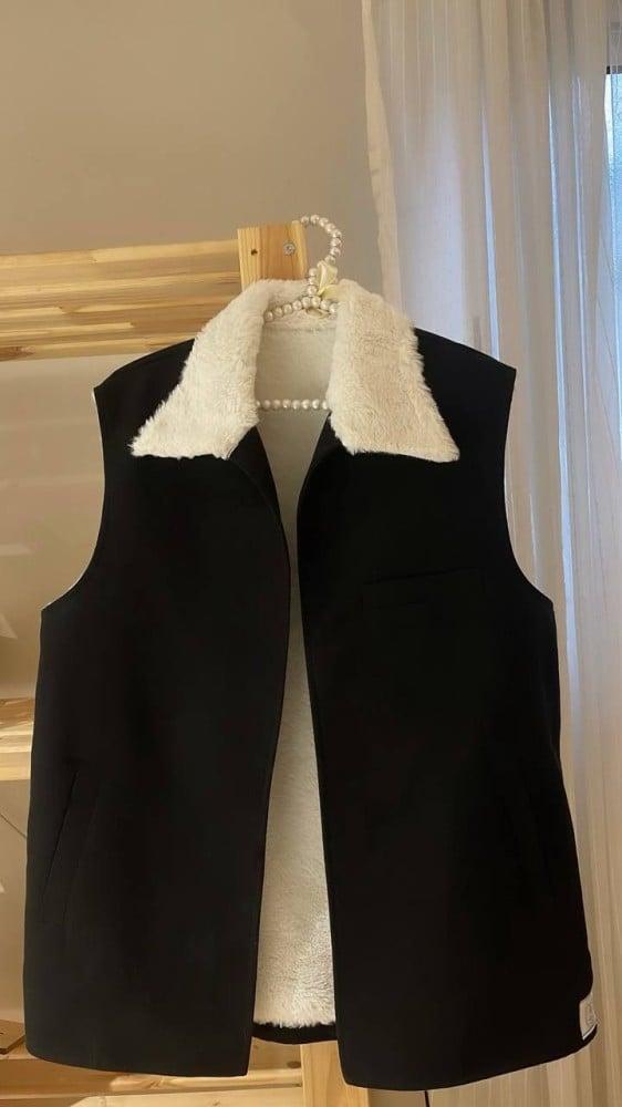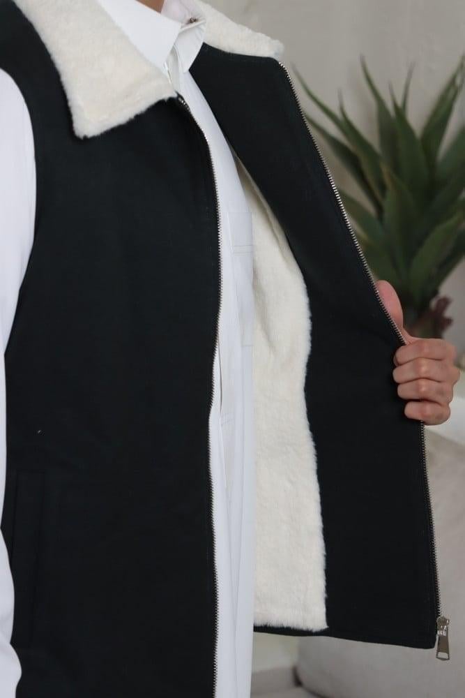 سديري رجالي بسحاب قلاب صوف لون اسود مع فرو ابيض