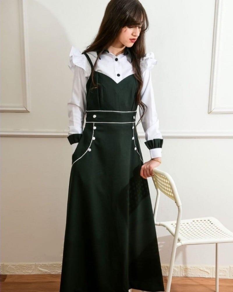 صمم بقطعتين شيال بلون اسود بتصميم فتحة رقبة ناعمة مع قميص منفصل بلون ابيض