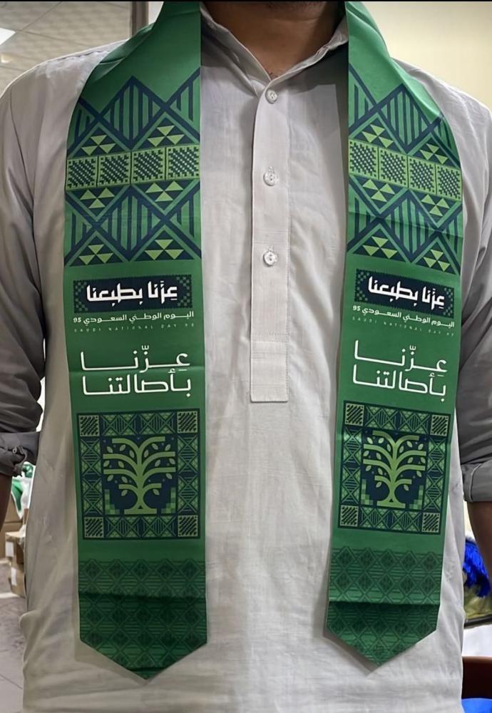 الوشح مصنوع من أقمشة عالية الجودة تضمن الراحة والأناقة في آن واحد. ويعتبر هذا الوشح خيارًا مثاليًا للاحتفال باليوم الوطني، حيث يرمز إلى الفخر بالهوية الوطنية ويعكس الأناقة التقليدية بلمسة عصرية.